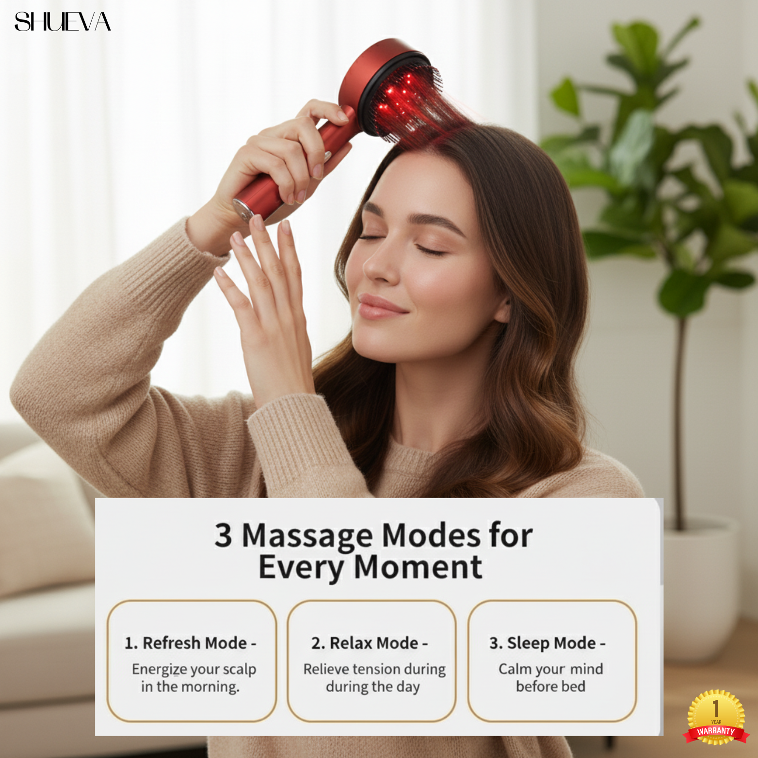 Shueva™ combines red-light therapy, micro-vibration massage, and nutrient absorption to target the real cause of thinning hair — poor scalp circulation and weak follicles.